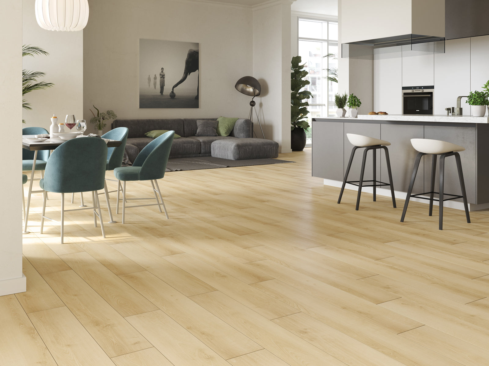 This 12mm is a beautiful beige oak. If you want your room to give that uplifting and vibrant vibe, then the Austin is the floor for you. The thickness of the 12mm Austin laminate gives you a solid feel under foot and water resistant top layer to help against spillage. Its AC5 rating and easy click system means you can be confident using it in all heavy traffic areas.